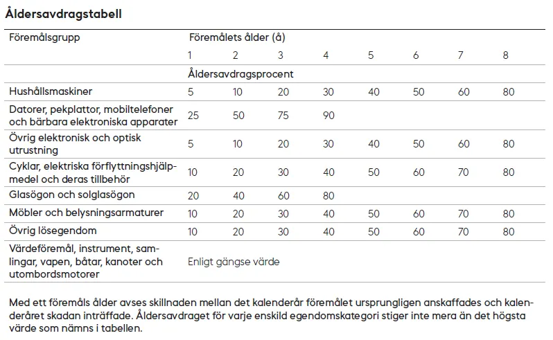 - Försäkring till fullt värde innebär inte att du alltid får en ersättning för den gamla skadade egendomen enligt priset på en ny motsvarande egendom. Ersättningsbeloppet påverkas också av andra omständigheter i skadesituationen, såsom den skadade egendomens ålder.