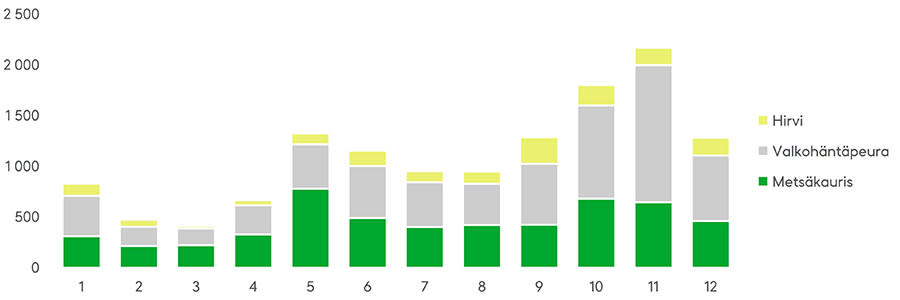 Hirvieläinonnettomuuksia tapahtuu erityisesti toukokuussa ja loppuvuodesta. Lähde: Tilastokeskus