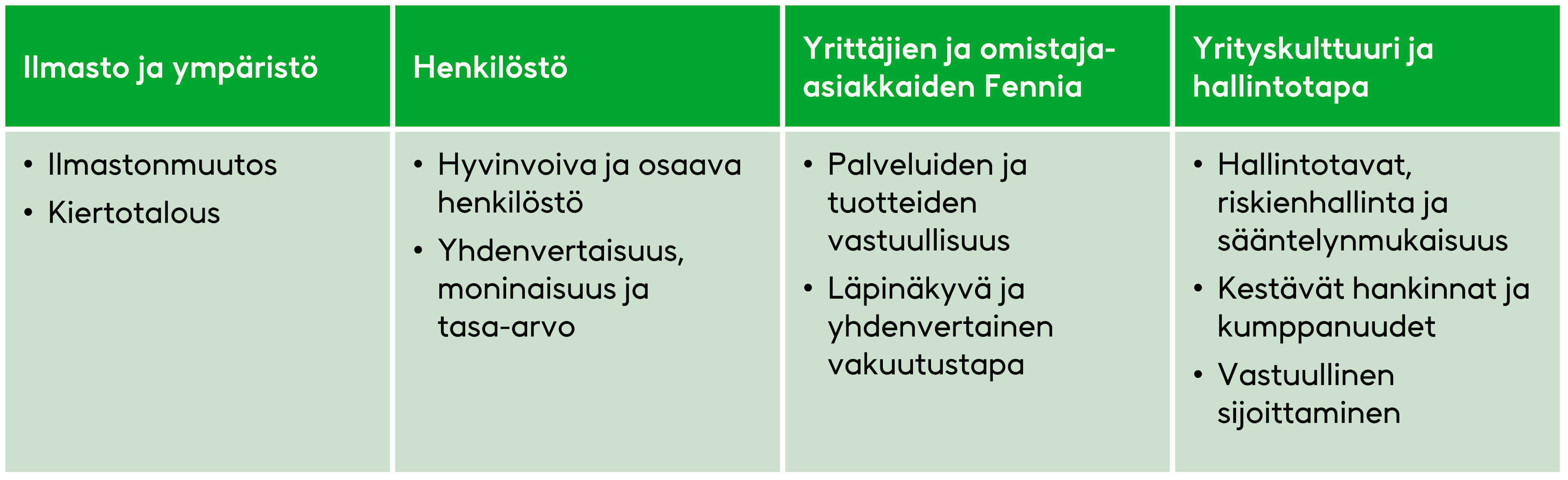 Vastuullisuusohjelmamme pääteemat on siten valittu huolellisen harkinnan ja arvioinnin tuloksena. Ne ovat ilmasto ja ympäristö, henkilöstö, yrittäjien ja omistaja-asiakkaiden Fennia sekä yrityskulttuuri ja hallintotapa. Vastuullisuusohjelmalla me sitoudumme vastuullisen toimintamme jatkuvaan parantamiseen ja kestävään kehitykseen.