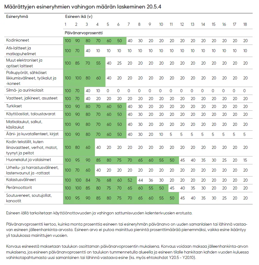 Jälleenhankinta-arvon mukaisena korvataan, jos esineen päivänarvoprosentin on taulukossa tummennetulla alueella ja esineen tilalle hankitaan kahden vuoden kuluessa vahinkotapahtumasta uusi samanlainen tai lähinnä vastaava esine.